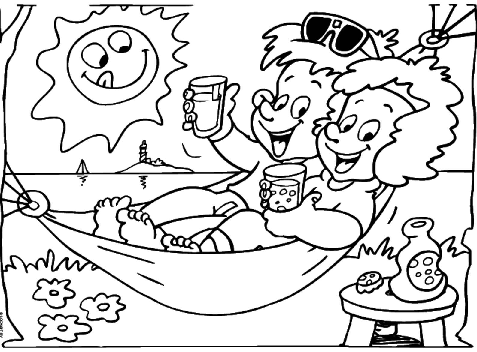 Ook van vakantievieren wordt je wel eens moe. Deze kinderen rusten uit en genieten van hun koude limonade in hun hangmat. Je downloadt deze zomer kleurplaat hier: